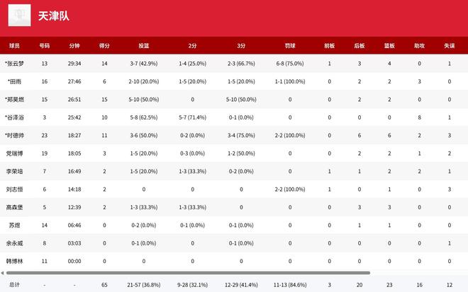 天津男篮张云梦14分4板,谷泽浴10分8助,郑昊燃15分2板;